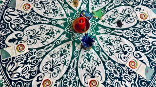 Here we go, we start the workshop with introductions, but not just any introductions. We have to describe ourselves using one feeling, one element, one color, and a place that is dear to us. One by one, we read what we’ve written on our small red papers. Then we dive into the heart of the matter. There are about ten small flat stones, each with distinct shapes and sizes arranged on the floor. Yeral invites us to choose the stone that attracts us the most, the one that inspires us. With our stone in hand, Marie and Yeral explain that today’s workshop involves painting our stone. The theme? Our inner fire. It’s a broad topic that allows us to let our imaginations run wild. We head over to the table adorned with various paint pots, brushes, containers, and all the necessary materials for creating our artworks.