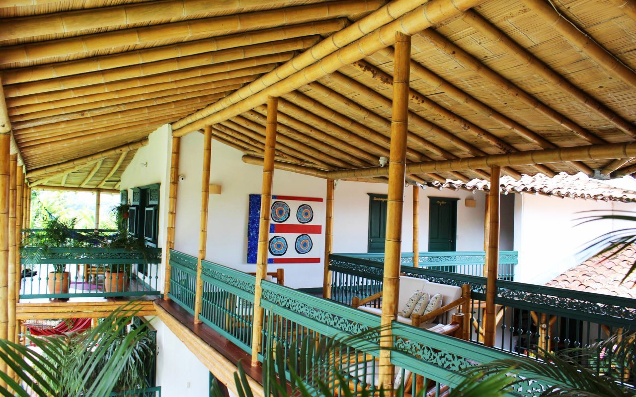 Once we’ve eaten, we explore the house built of bamboo, clay and guaduas (a type of bamboo known as the largest Neotropical bamboo). The beautiful house, however, retains the typical style of houses in the coffee region. The mountains of the Andes on the horizon, the swimming pool, the works of art hanging on the walls and the books available make this place very charming. We’ve all been won over by this combination of rustic comfort and contemporary art.