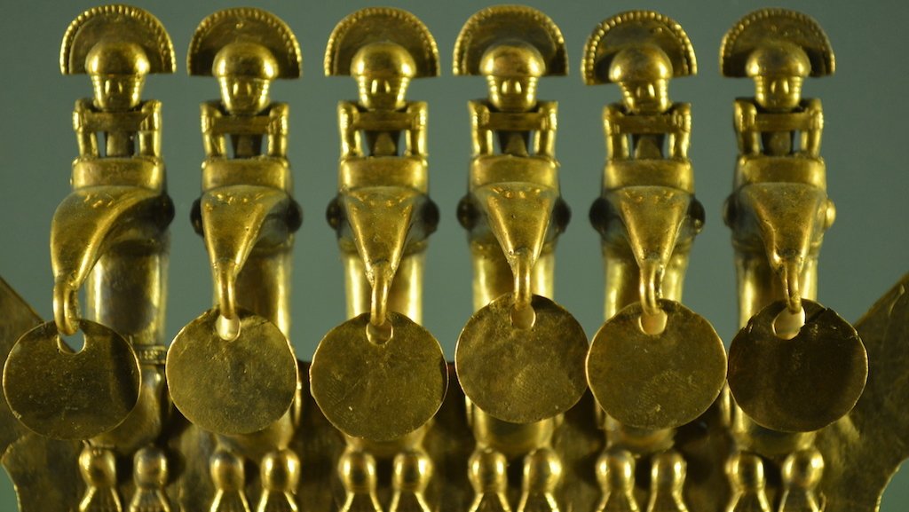 You’ll discover all kinds of objects: jewelry (necklaces, earrings, bracelets, narigueras – nose ornaments -, brooches…), everyday tools (fishhooks, needles, combs…) and even textiles (in Quindio, the Quimbayas Indians also used gold for clothing).